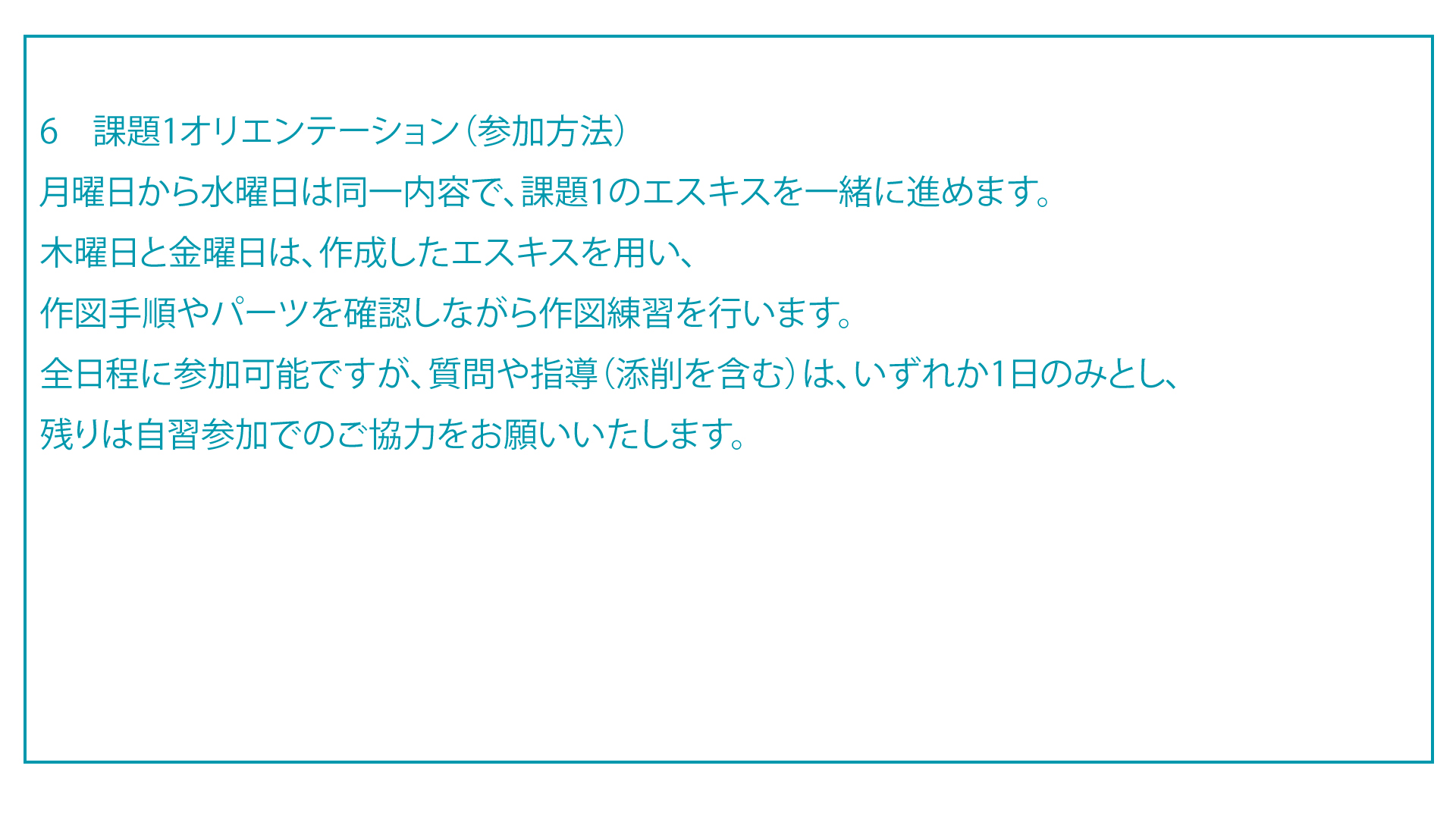 毎週の講義では、朝の座学終了後の11時から17時30分まで、実際の試験と同じ時間帯に課題を6.5時間通しで実習します。通し実習中は、受講生一人ひとりの進捗に応じて個別に助言やフォローを行い、時間配分が十分に身についていない場合は、工程ごとにタイムアナウンスを行うことで、試験本番でも平常心をもって臨めるようサポートします。