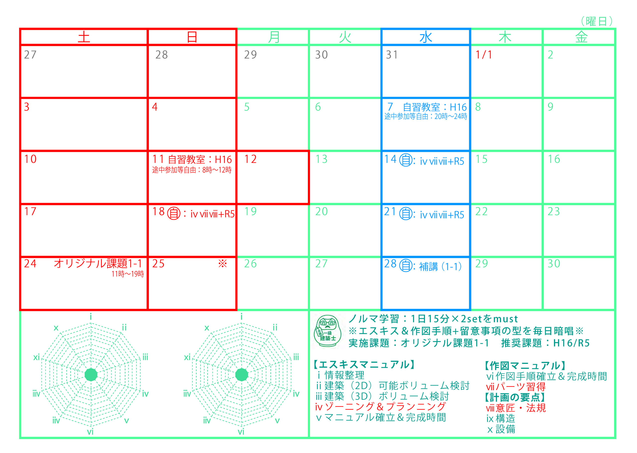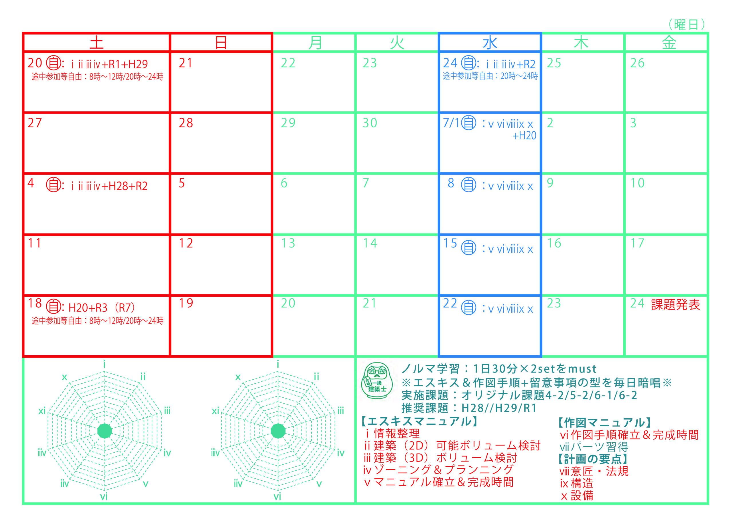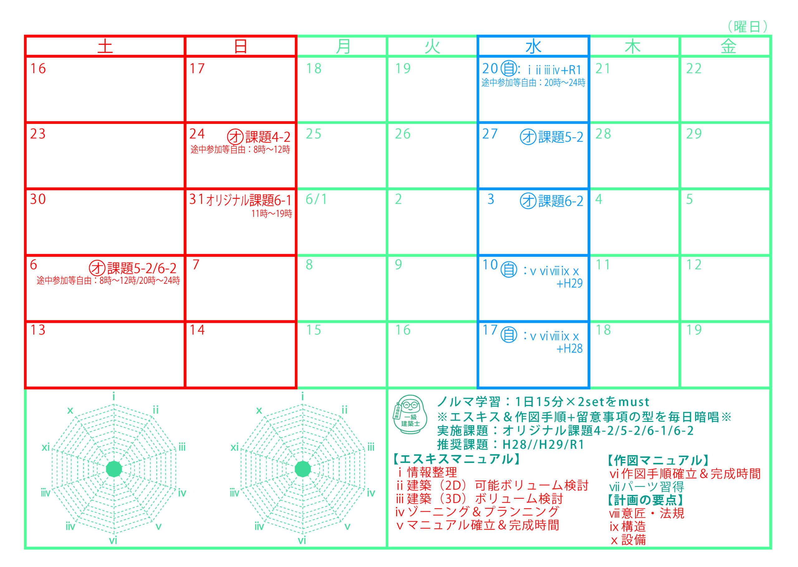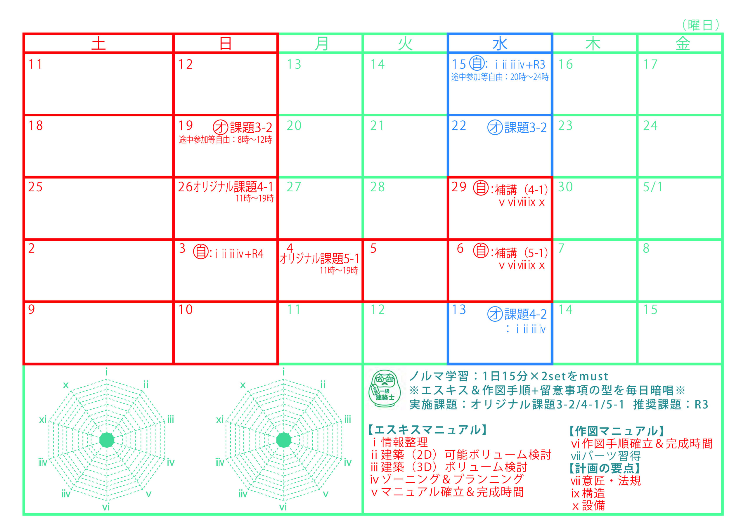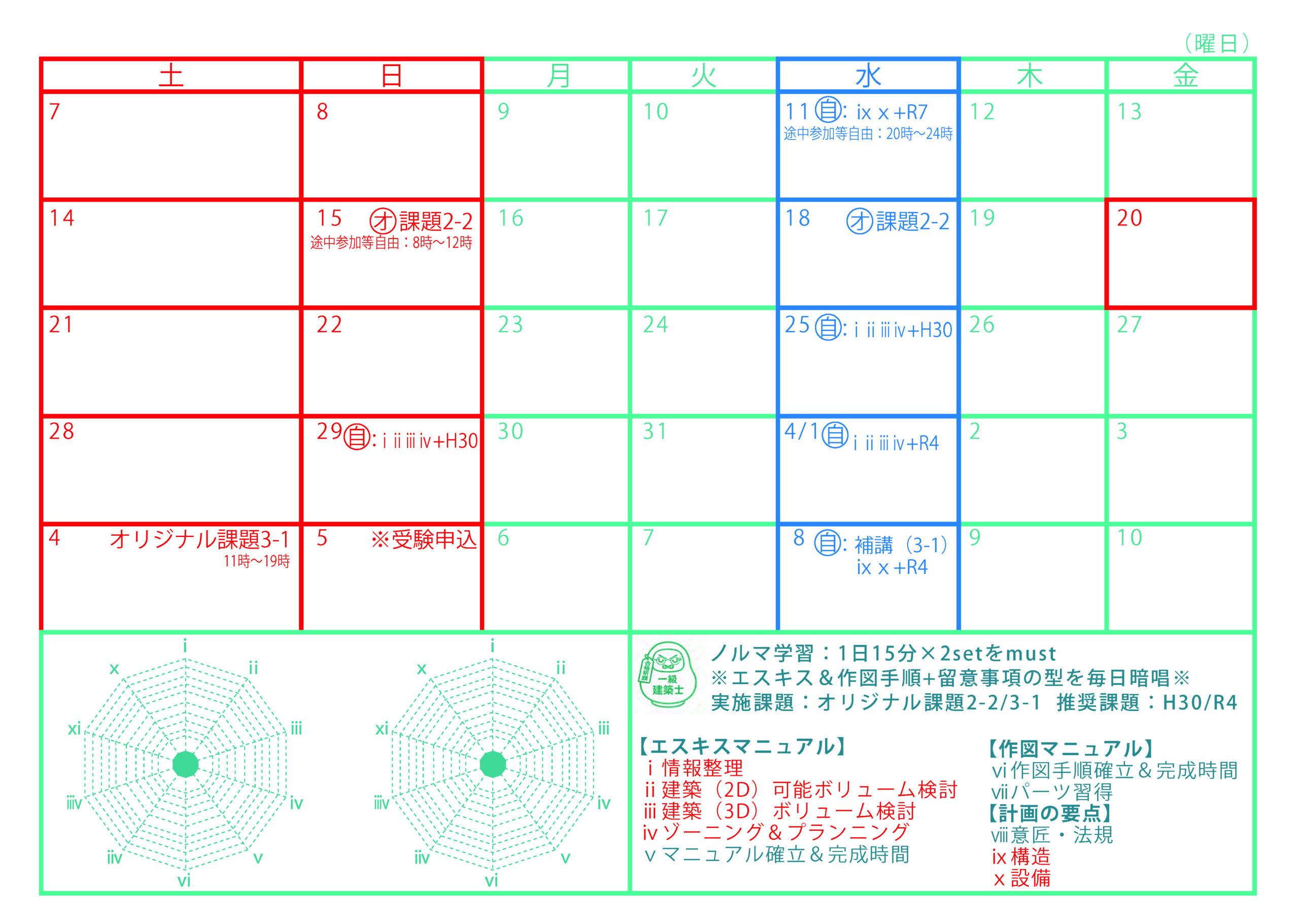 エスキスも作図もミスを少なく完成させるには、安定したチェック時間が必要です。 しかし、チェック時間を確保するだけでは意味がありません。 当社のエスキス及び作図マニュアルでは、各工程で行うチェック項目を確実に実施し、一度確認した内容を変更しない (=手戻りによって混乱し、計画がまとまらなくならないようにする)方法をマニュアル化し、反復練習を通じて型を身につけることで、 試験本番もマニュアル遵守することで、焦りによるミスを減らし、法不適合や条件等の重大な不適合を回避し、高い完成度を実現します。