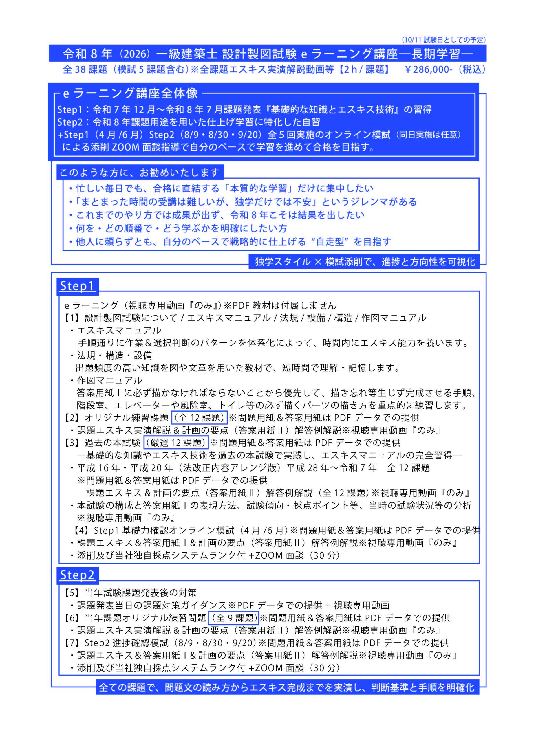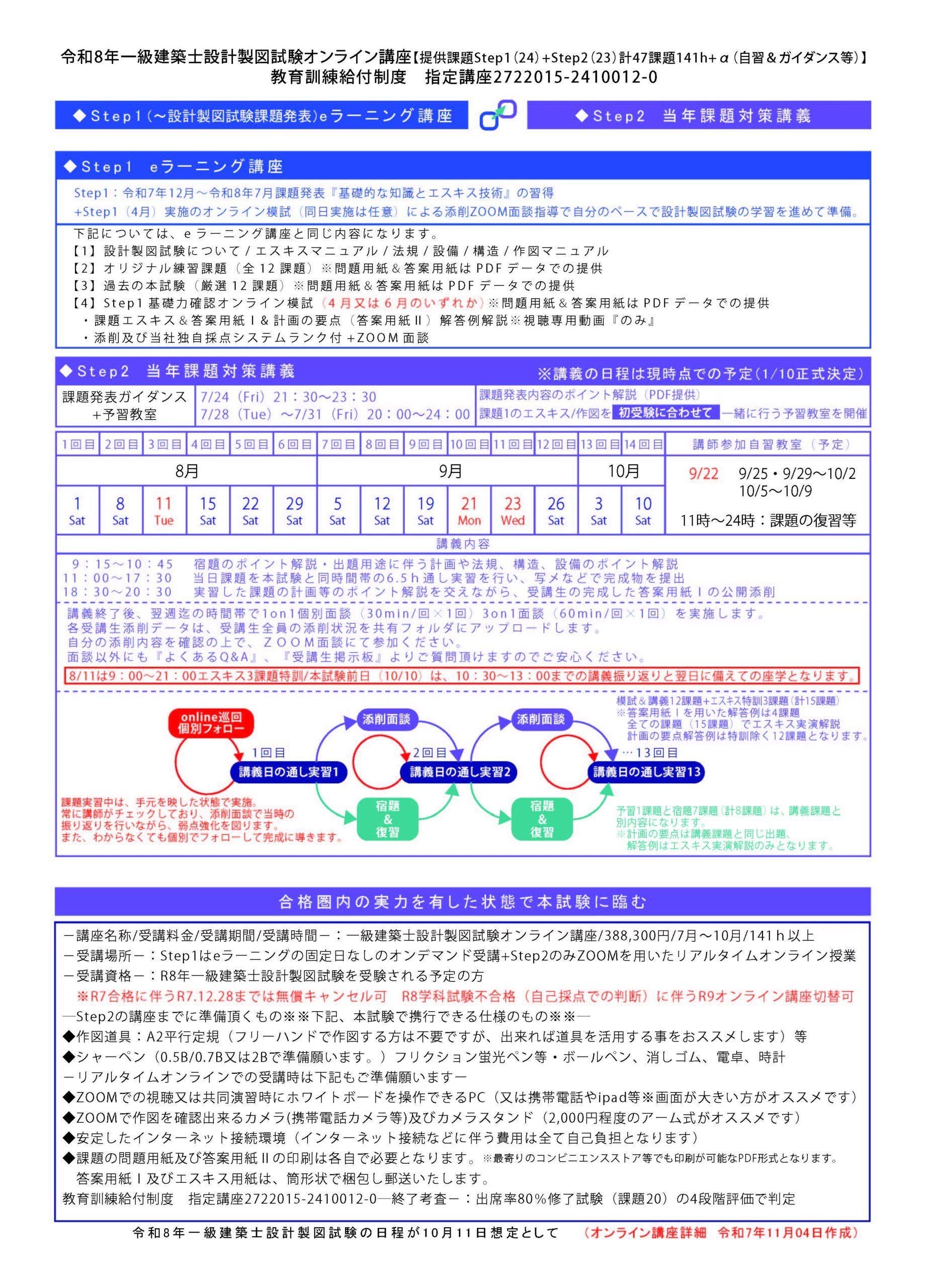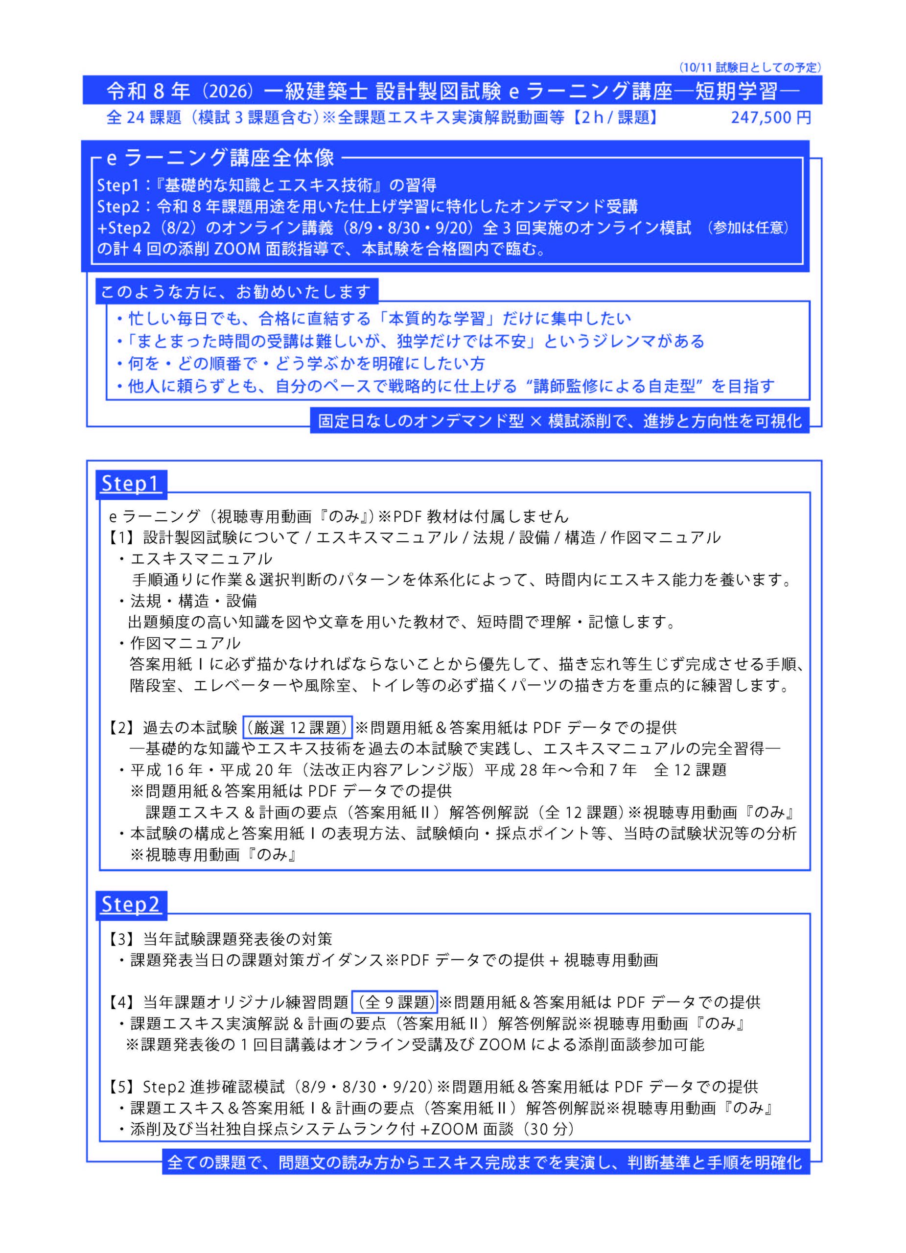 一級建築士製図試験オンライン講座(短期)/合格カリキュラム(フルパック)定員:最小15~最大26名※通常講義の参加定員15名※
